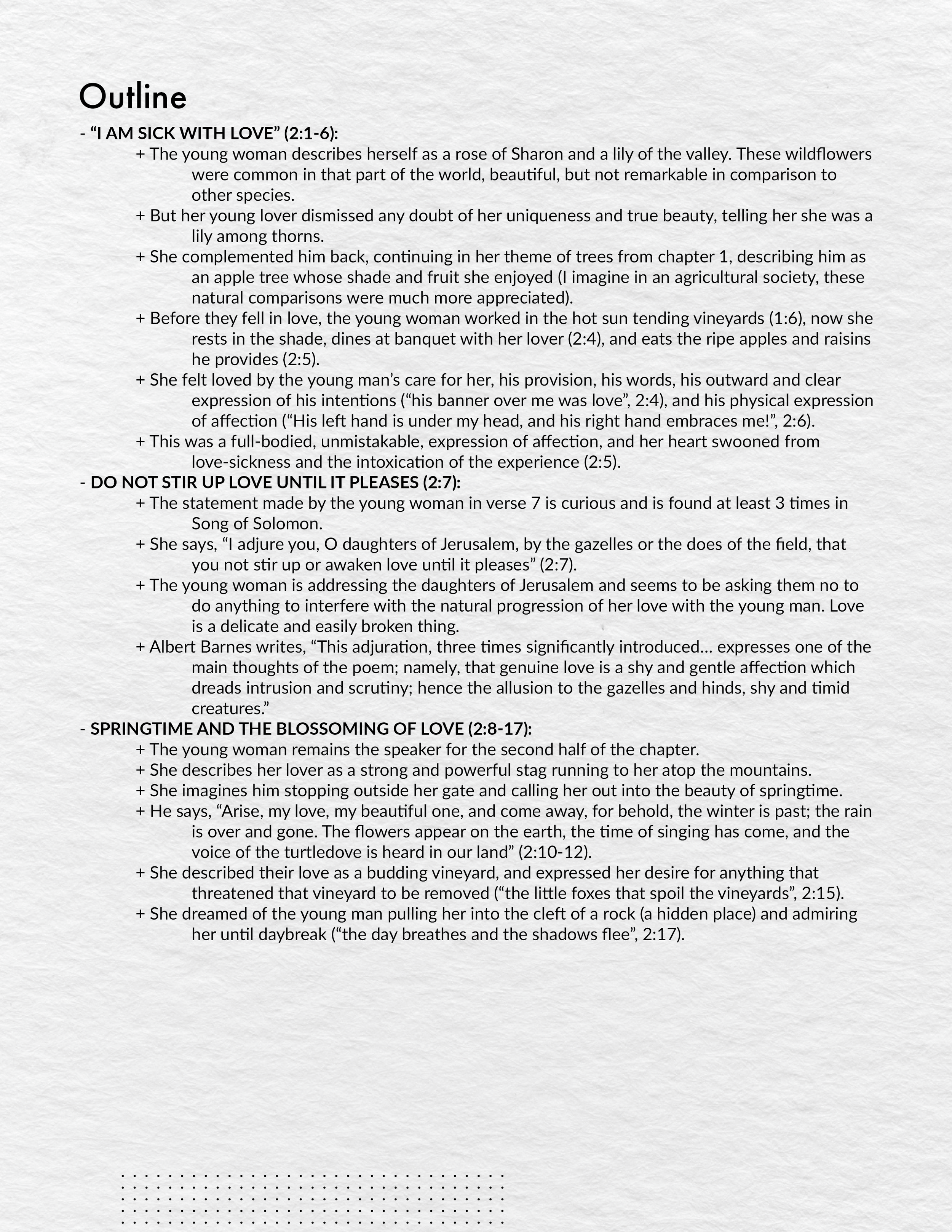 Albert Barnes writes, “This adjuration, three times significantly introduced… expresses one of the main thoughts of the poem; namely, that genuine love is a shy and gentle affection which dreads intrusion and scrutiny; hence the allusion to the gazelles and hinds, shy and timid creatures.”